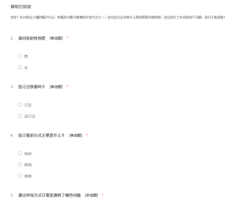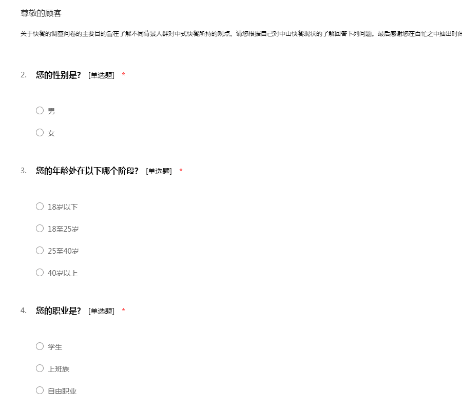 关于快餐的调查问卷的主要目的旨在了解不同背景人群对中式快餐所持的观点。请您根据自己对中山快餐现状的了解回答下列问题。最后感谢您在百忙之中抽出时间完成关于快餐的调查问卷。