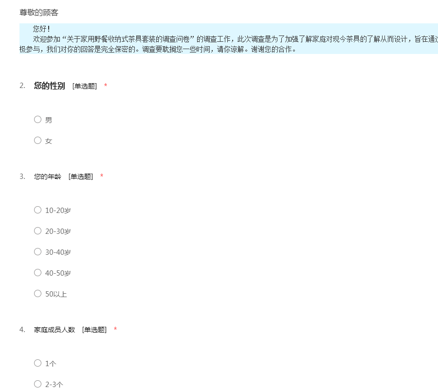 您好! 欢迎参加“关于家用野餐收纳式茶具套装的调查问卷”的调查工作,此次调查是为了加强了解家庭对现今茶具的了解从而设计,旨在通过对此调查对茶具做出改进。希望你能积极参与,我们对你的回答是完全保密的。调查要耽搁您一些时间,请你谅解。谢谢您的合作。