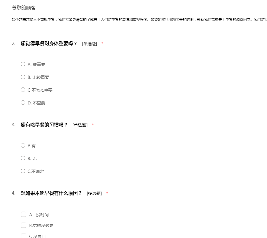 如今越来越多人不重视早餐,我们希望更清楚的了解关于人们对早餐的看法和重视程度。希望能够利用您宝贵的时间,帮助我们完成关于早餐的调查问卷。我们对此不胜感激,谢谢!
