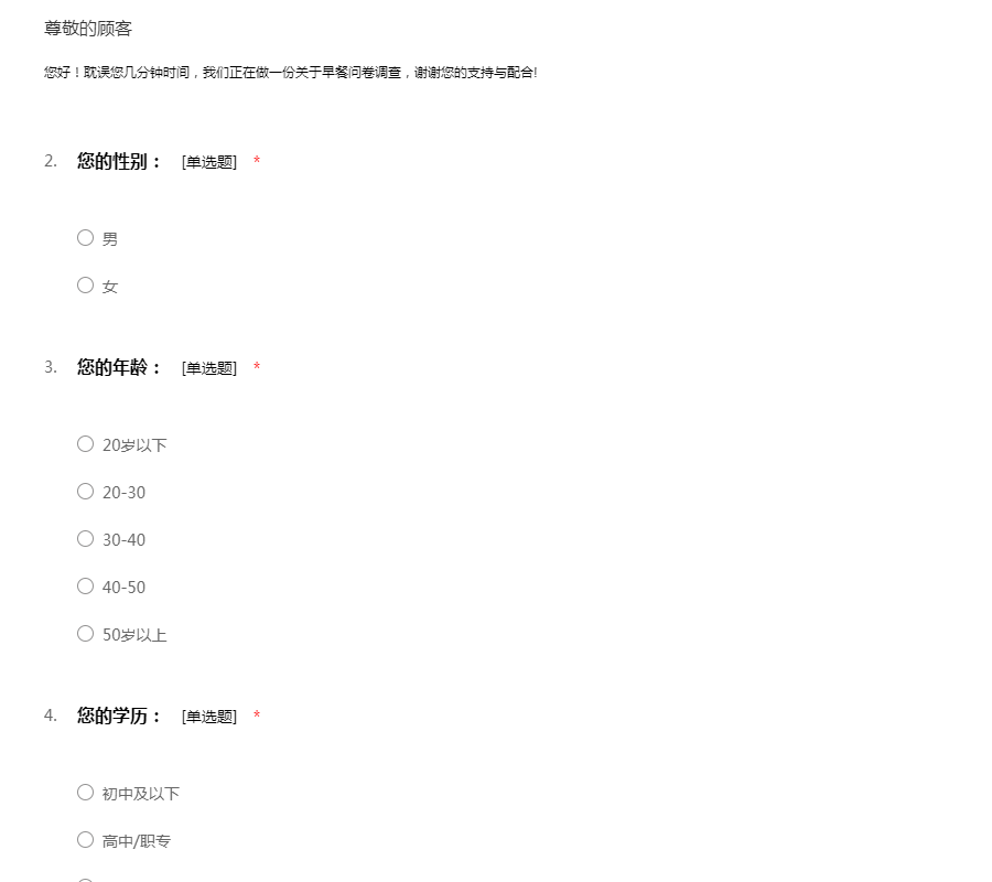 您好!耽误您几分钟时间,我们正在做一份关于早餐问卷调查,谢谢您的支持与配合!