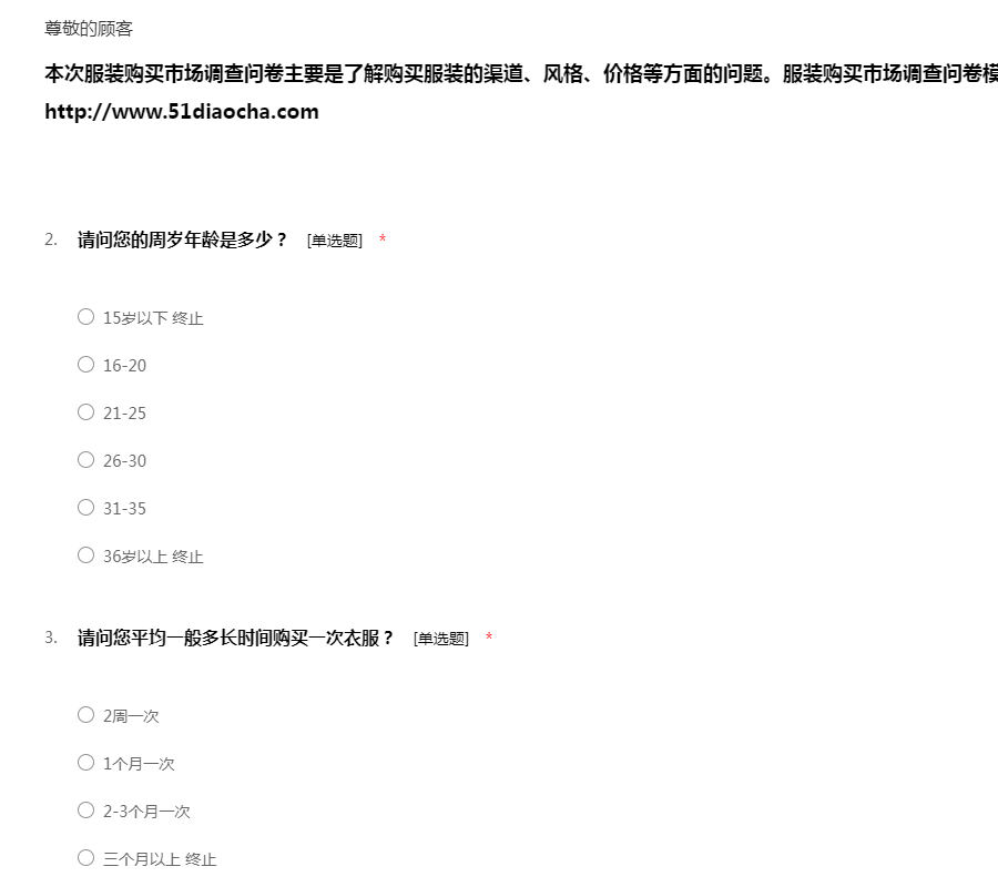 感谢您参与“服装调查问卷”,本次调查是为了了解消费者对于服装购买选择的情况,以便对服装市场做出更贴合消费者的调整,调查所得的结果对您的工作和生活不会带来任何不良影响,请您根据自己的实际情况放心填写,51调查网感谢您的配合!