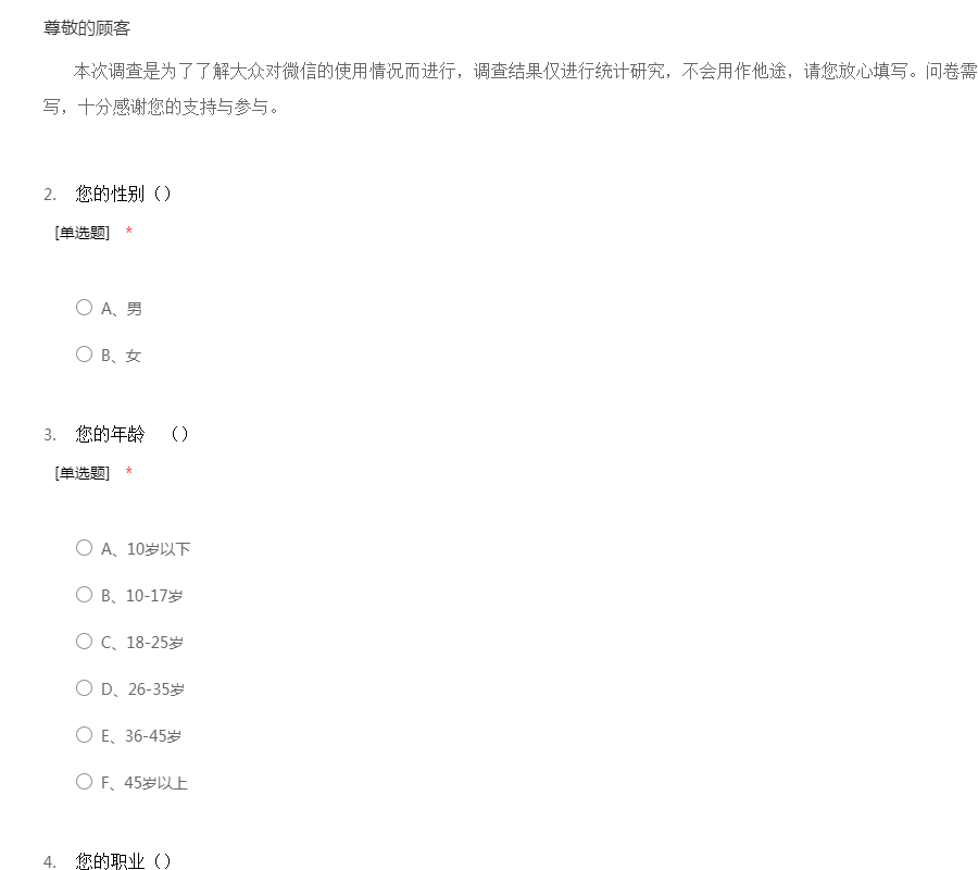 本次调查是为了了解大众对微信的使用情况而进行,调查结果仅进行统计研究,不会用作他途,请您放心填写。问卷需要花费您一些时间,希望您能耐心填写,十分感谢您的支持与参与。