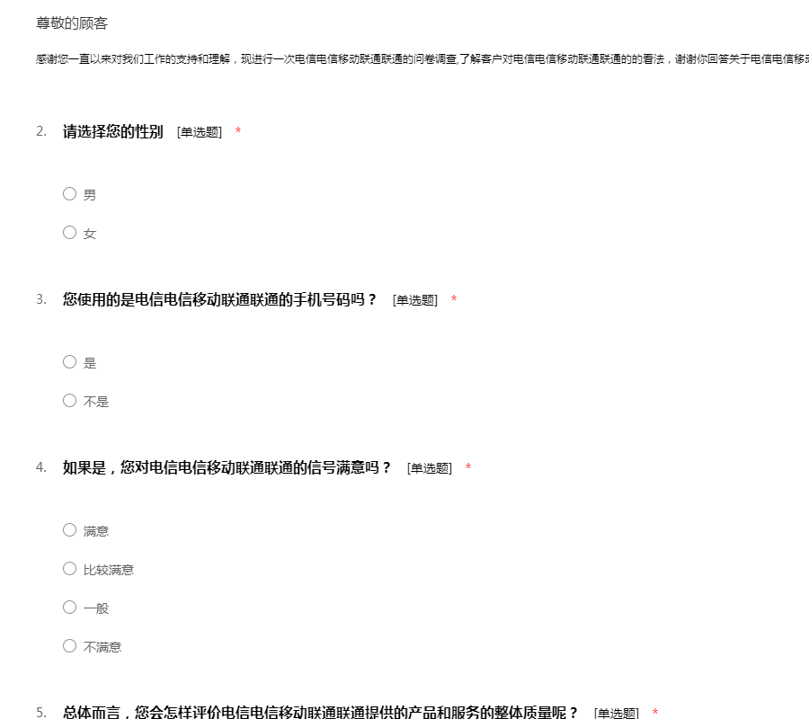 感谢您一直以来对我们工作的支持和理解,现进行一次电信电信移动联通联通的问卷调查,了解客户对电信电信移动联通联通的的看法,谢谢你回答关于电信电信移动联通联通的问卷调查的问题,谢谢你的合作。