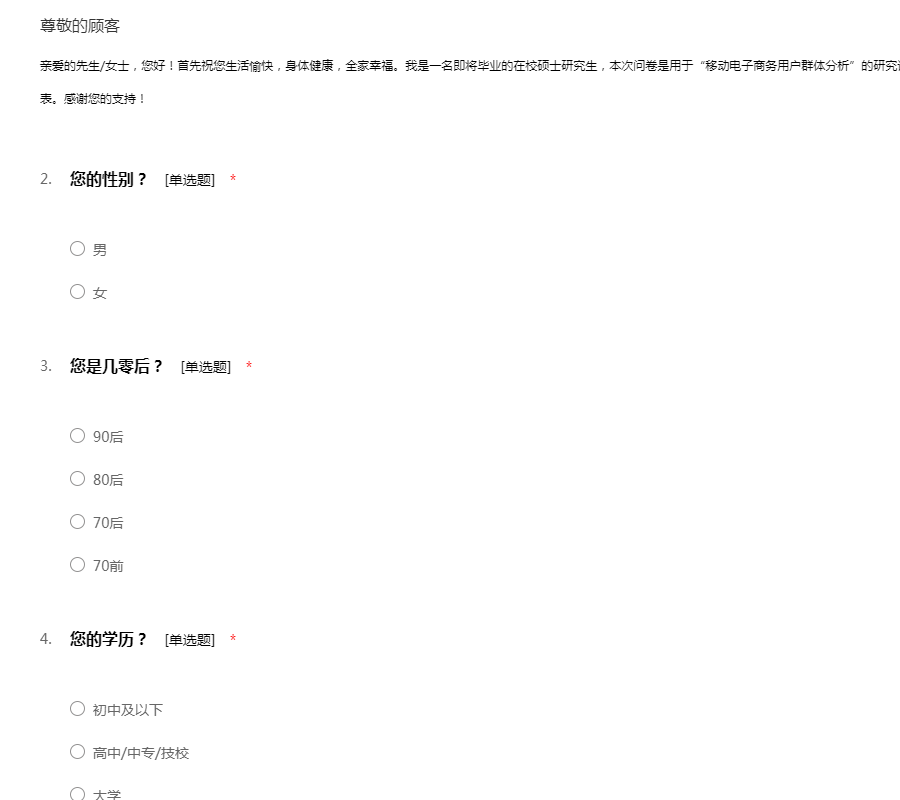 亲爱的先生/女士,您好!首先祝您生活愉快,身体健康,全家幸福。我是一名即将毕业的在校硕士研究生,本次问卷是用于“移动电子商务用户群体分析”的研究论文,占用您一点分钟时间,回答这份问卷调查表。感谢您的支持!