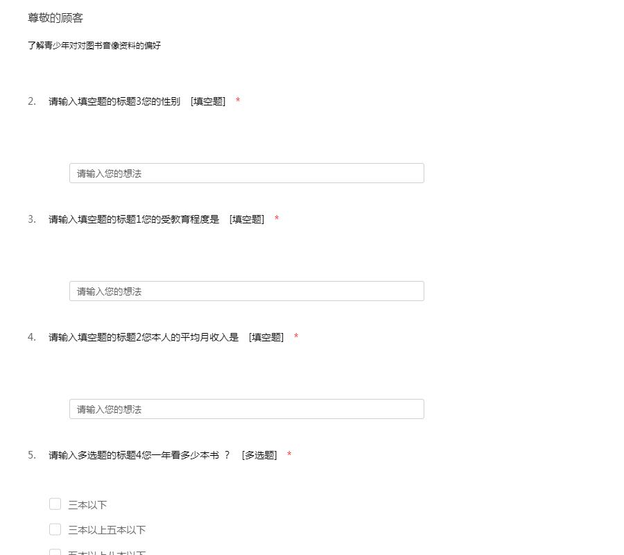 为了了解青少年对于图书、音像资料的偏好的基本情况,对图书馆书记的选购和管理提供更好的参考建议,特发放此问卷,希望您能在百忙之中帮忙配合完成,谢谢!