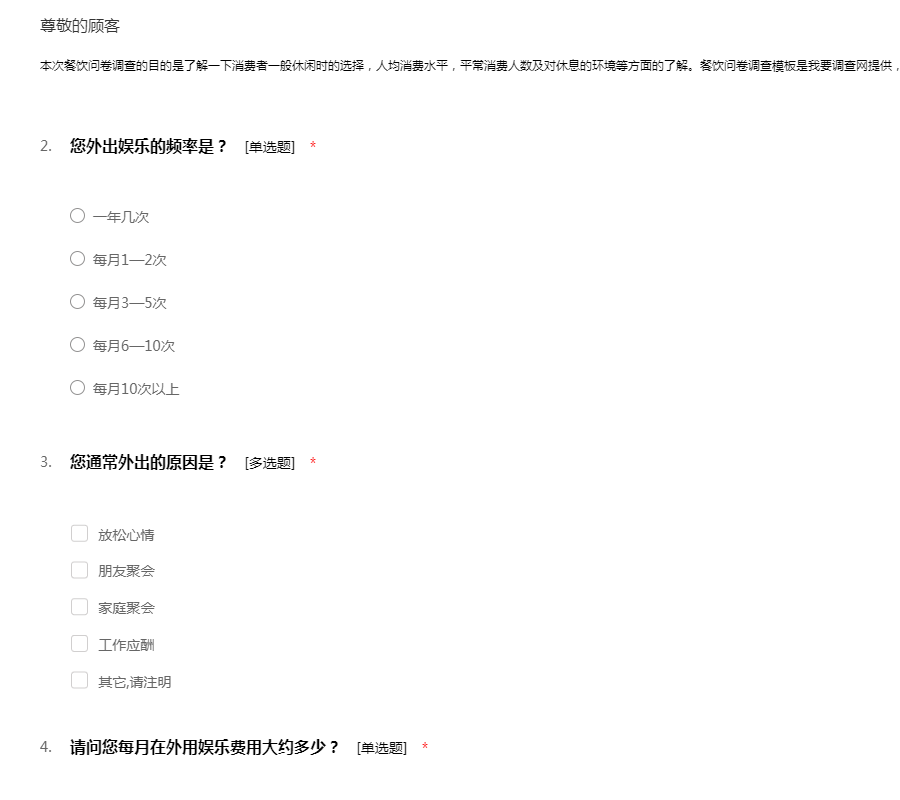 本次餐饮问卷调查的目的是了解一下消费者一般休闲时的选择,人均消费水平,平常消费人数及对休息的环境等方面的了解。餐饮问卷调查模板是我要调查网提供,网址: http://www.51diaocha.com