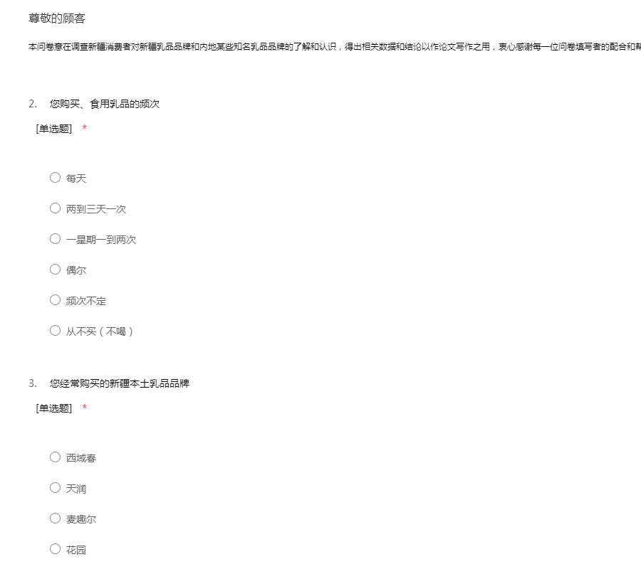 本问卷意在调查新疆消费者对新疆乳品品牌和内地某些知名乳品品牌的了解和认识,得出相关数据和结论以作论文写作之用,衷心感谢每一位问卷填写者的配合和帮助!