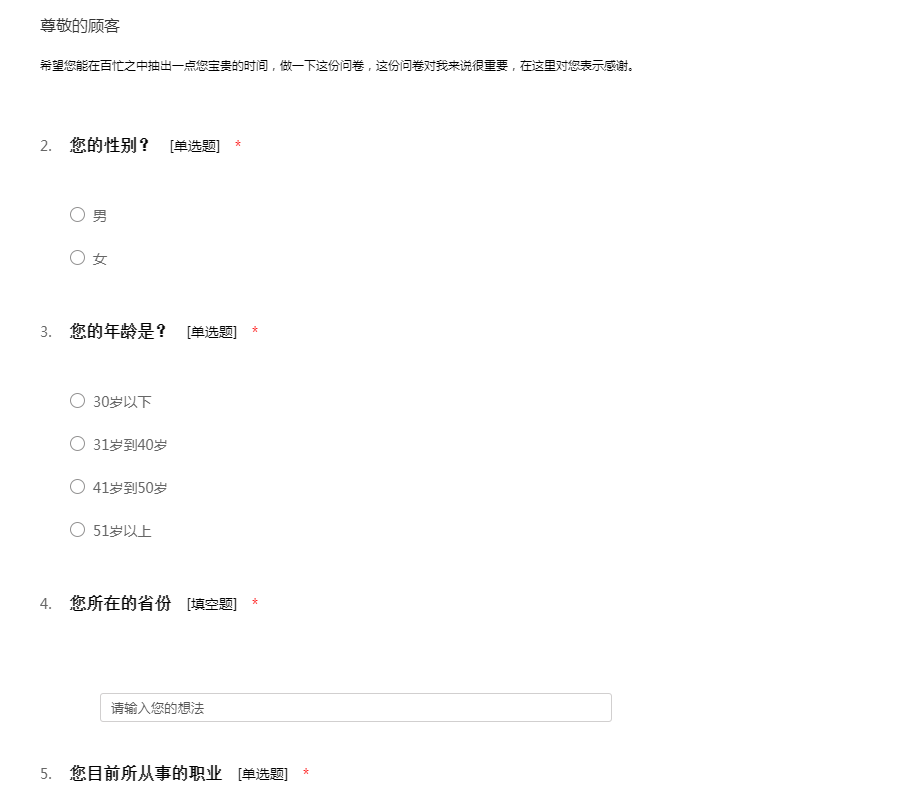 感谢您参与“保险公司声誉评价指标”的消费者调查,此次调查主要是为了了解保险公司声誉评价指标的情况,调查所得的结果对您的工作和生活不会带来任何不良影响,请您根据自己的实际情况放心填写,51调查网感谢您的配合!