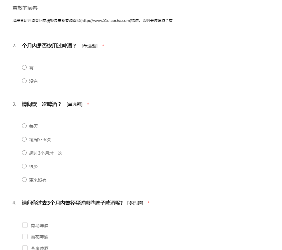 消费者研究调查问卷模板是由我要调查网(http://www.51diaocha.com)提供。否购买过啤酒?有