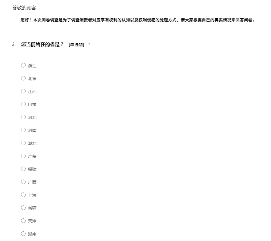您好!本次问卷调查是为了调查消费者对应享有权利的认知以及权利侵犯的处理方式,请大家根据自己的真实情况来回答问卷。
