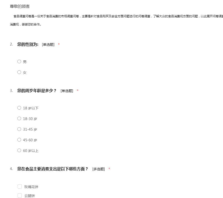 食品调查问卷是一份关于食品消费的市场调查问卷,主要是针对食品购买及安全方面问题进行的问卷调查,了解大众的食品消费观方面的问题,以此展开问卷调查活动,耽误您一些宝贵时间,回答大众的食品消费观,谢谢您的合作。