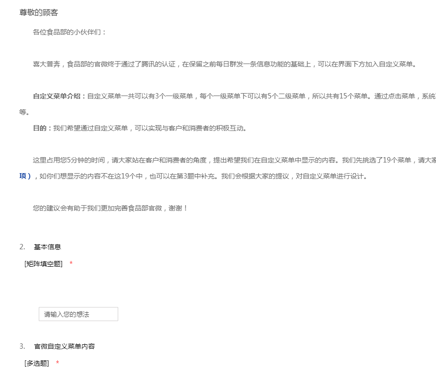 这里占用您5分钟的时间,请大家站在客户和消费者的角度,提出希望我们在自定义菜单中显示的内容。我们先挑选了19个菜单,请大家投票(可多选,选你最想体现的15项),如你们想显示的内容不在这19个中,也可以在第3题中补充。我们会根据大家的提议,对自定义菜单进行设计。