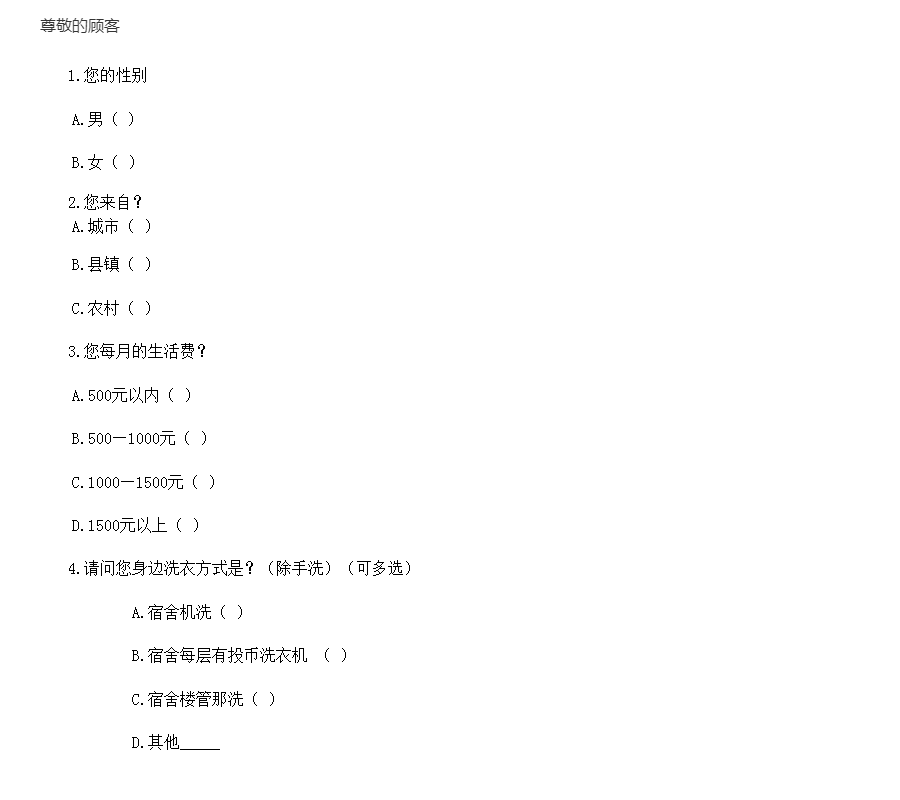 1.您的性别A.男( )B.女( )2.您来自?A.城市( )B.县镇( )C.农村( )3.您每月的生活费?A.500元以内( )B.500—1000元( )C.1000—1500元( )D.1500元以上( )4.请问您身边洗衣方式是?(除手洗)(可多选) A.宿舍机洗( ) B.宿舍每层有投币洗衣机 ( ) C.宿舍楼管那洗( ) D.其他_____