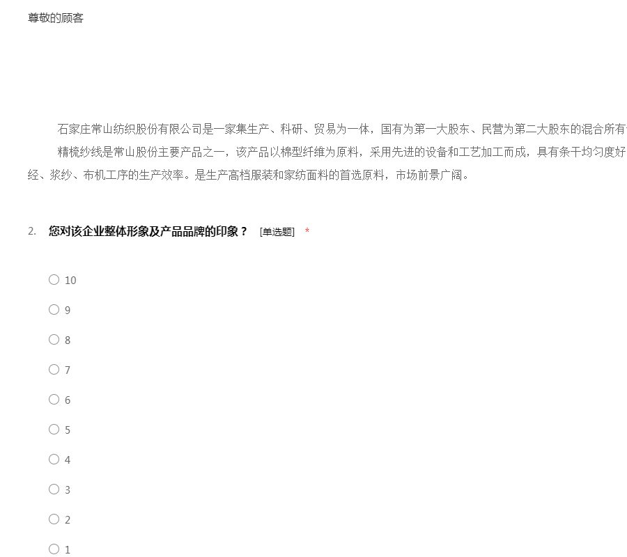 石家庄常山纺织股份有限公司 精梳纱问卷调查