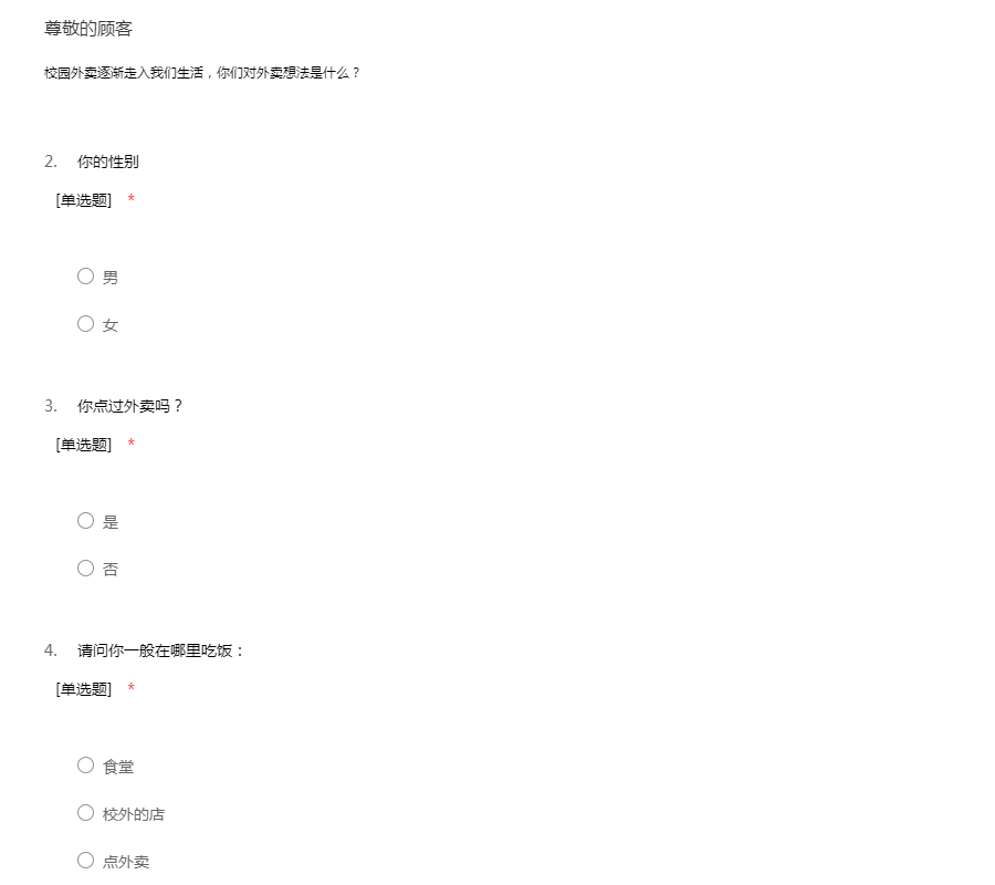 您好!我们正在开展关于商圈周围外卖市场状况的调查,共不超过20题。本调查纯属调查学习之用,请客观回答,问卷信息将严格保密,真诚感谢您的参与,谢谢。