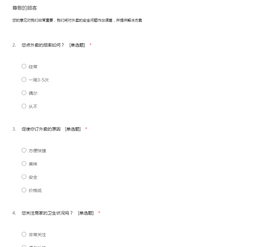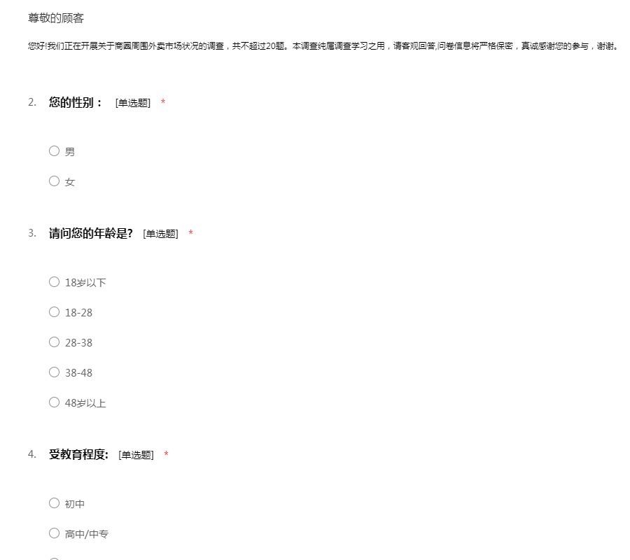 您好!我们正在开展关于商圈周围外卖市场状况的调查,共不超过20题。本调查纯属调查学习之用,请客观回答,问卷信息将严格保密,真诚感谢您的参与,谢谢。