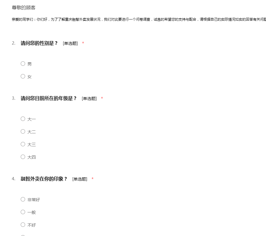亲爱的同学们:你们好,为了了解重庆融智外卖发展状况,我们对此要进行一个问卷调查,诚恳的希望您的支持与配合,请根据自己的实际情况如实的回答有关问题,占用了您的宝贵时间,向您致以深切的谢意。