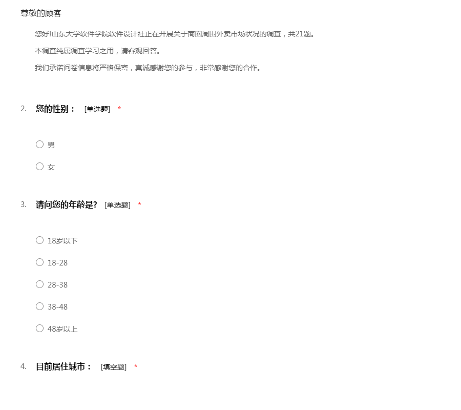 您好!山东大学软件学院软件设计社正在开展关于商圈周围外卖市场状况的调查,共21题。 本调查纯属调查学习之用,请客观回答。 我们承诺问卷信息将严格保密,真诚感谢您的参与,非常感谢您的合作。