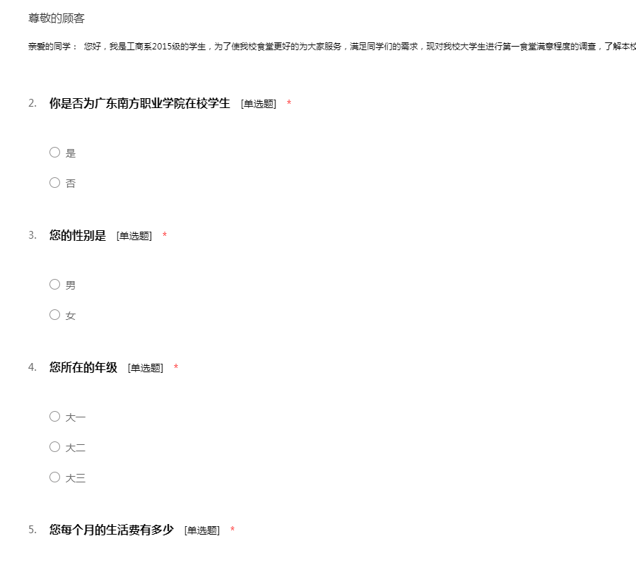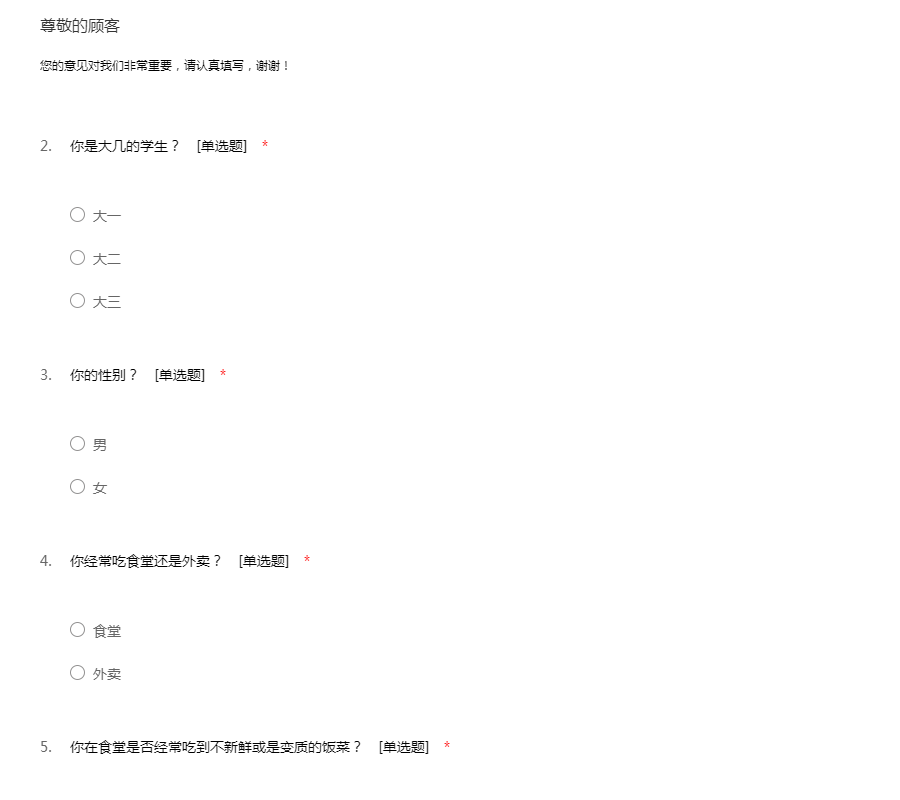 亲爱的同学: 您好,我是工商系2015级的学生,为了使我校食堂更好的为大家服务,满足同学们的需求,现对我校大学生进行第一食堂满意程度的调查,了解本校学生对食堂的看法。