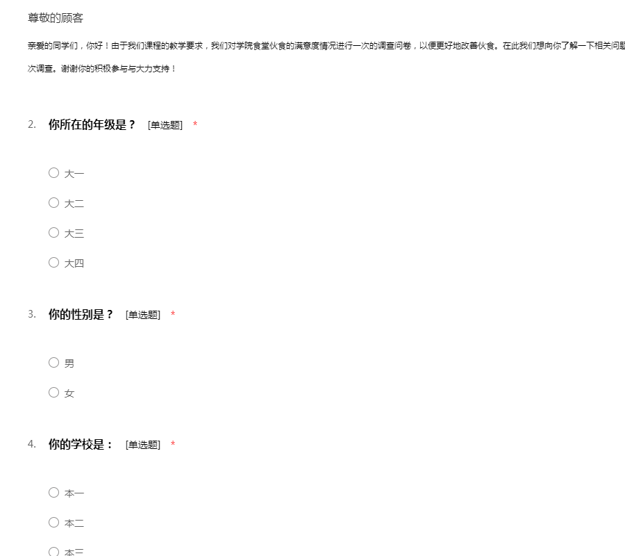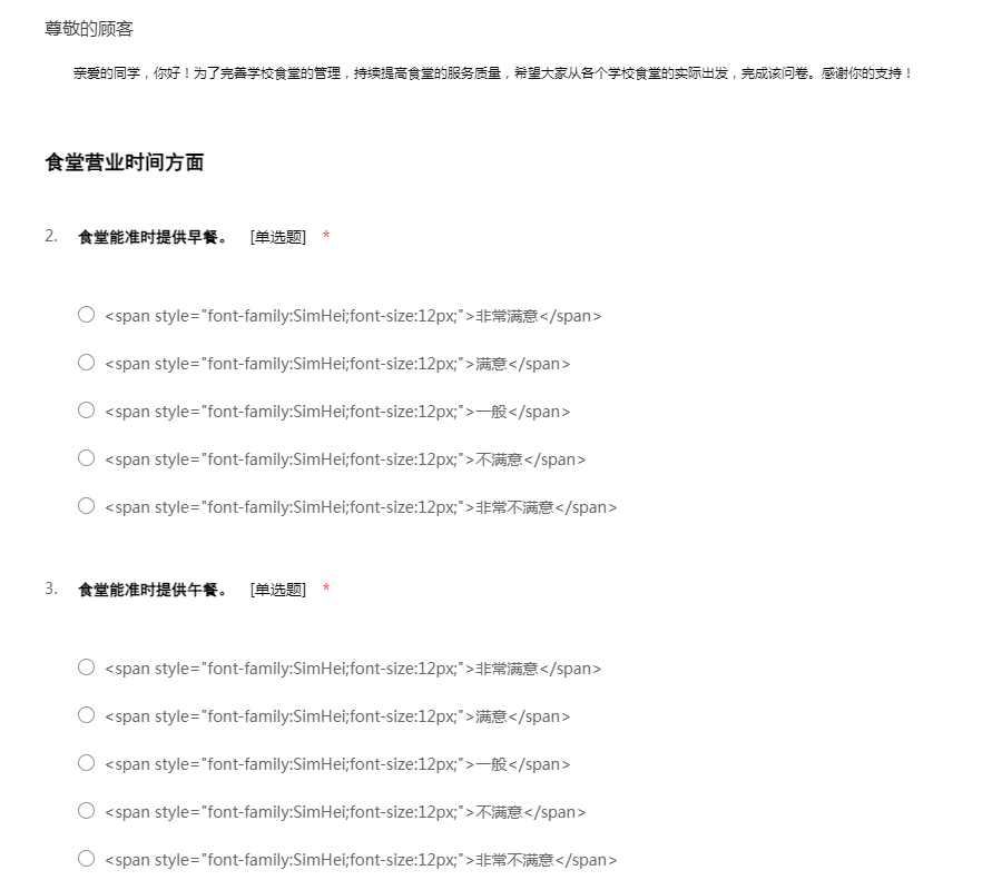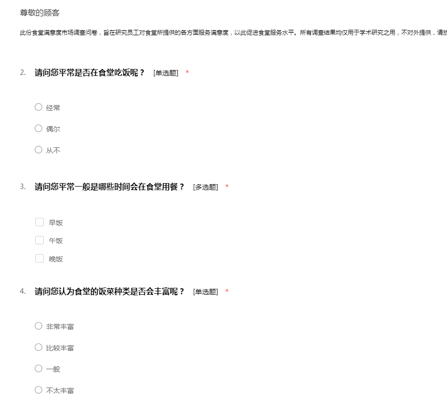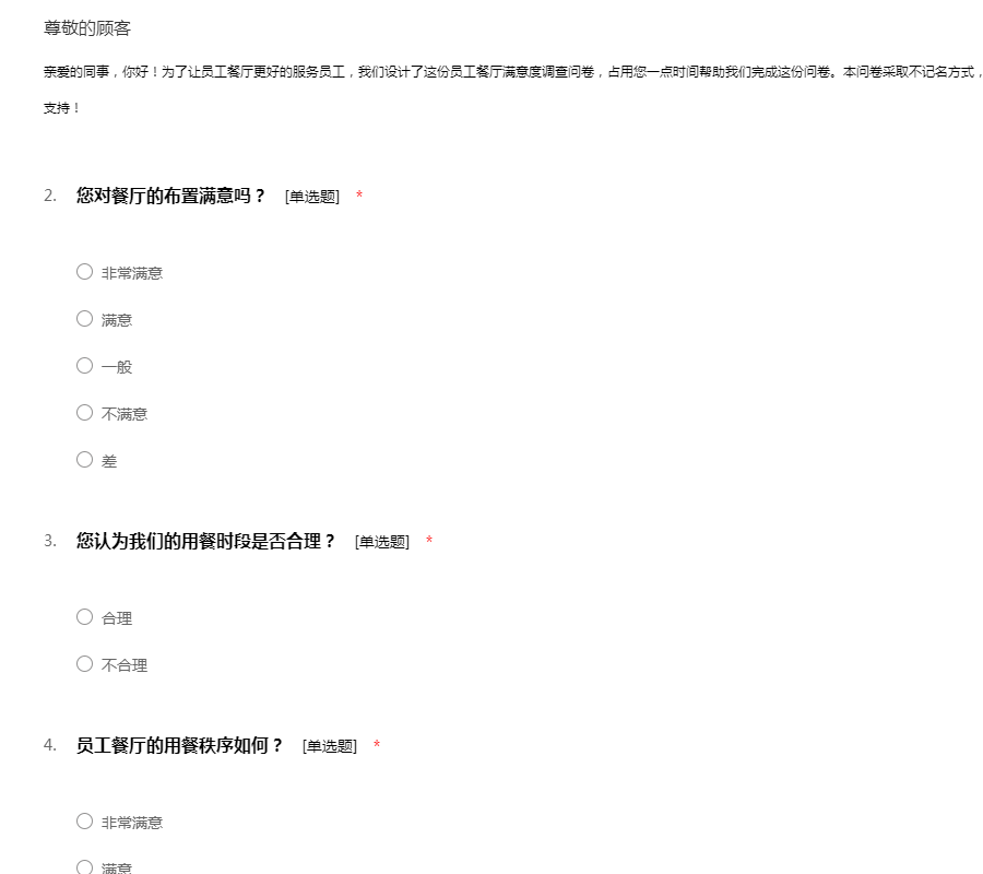 你好!为了让员工餐厅更好的服务员工,我们设计了这份员工餐厅满意度调查问卷,占用您一点时间帮助我们完成这份问卷。本问卷采取不记名方式,我们将会认真总结、分析并加以改进。感谢您的支持!