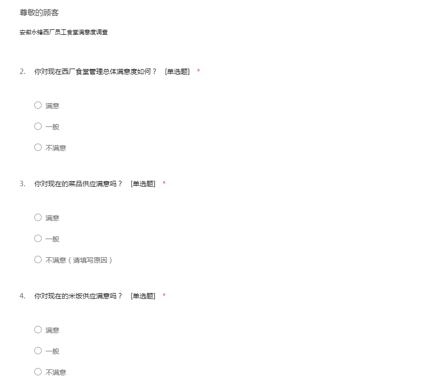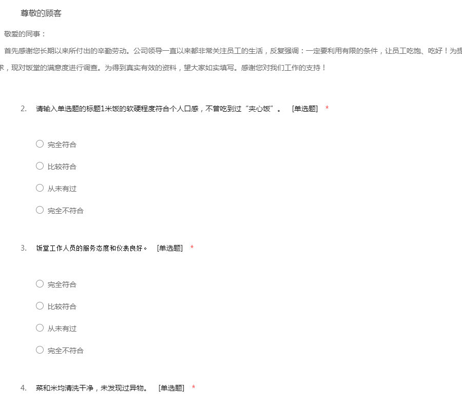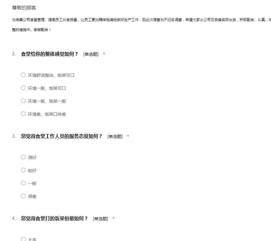 亲爱的同事,您好!为了完善公司食堂管理、持续提高食堂服务质量,让员工更加精神饱满地做好生产工作,现此次调查为不记名调查,希望大家从公司及自身实际出发,积极配合,认真详实地填写。谢谢配合!