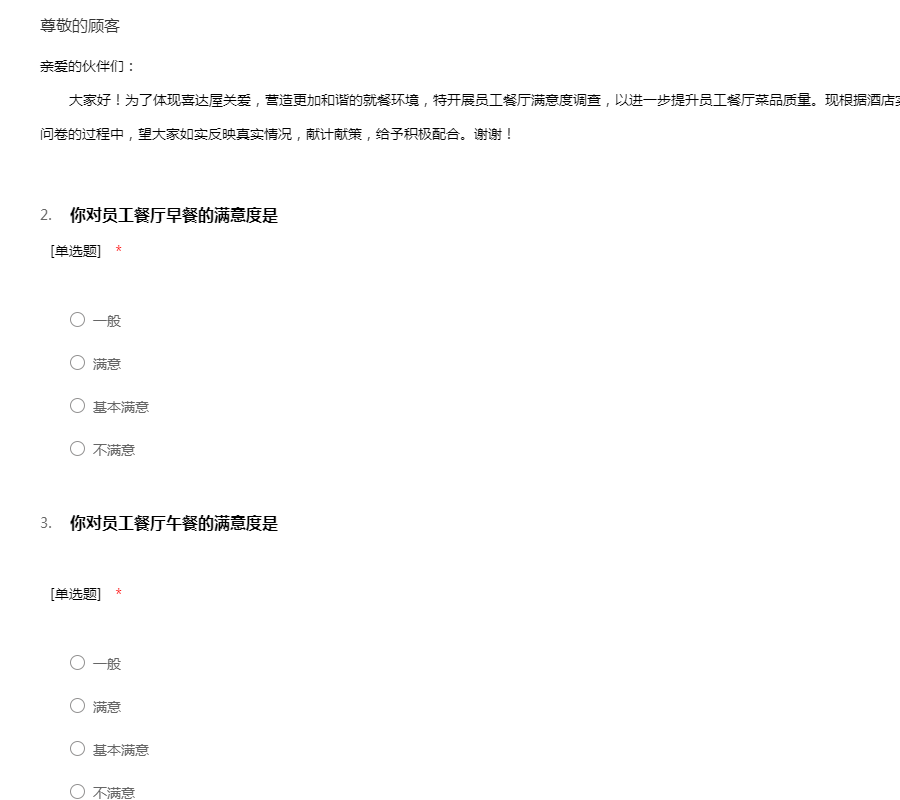 亲爱的伙伴们: 大家好!为了体现喜达屋关爱,营造更加和谐的就餐环境,特开展员工餐厅满意度调查,以进一步提升员工餐厅菜品质量。现根据酒店实际情况现设计满意度调查题目,在回答问卷的过程中,望大家如实反映真实情况,献计献策,给予积极配合。谢谢!