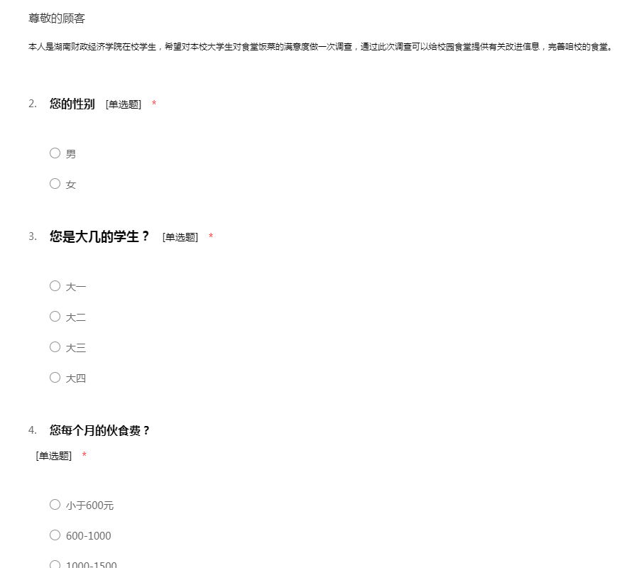 本人是湖南财政经济学院在校学生,希望对本校大学生对食堂饭菜的满意度做一次调查,通过此次调查可以给校园食堂提供有关改进信息,完善本校的食堂。