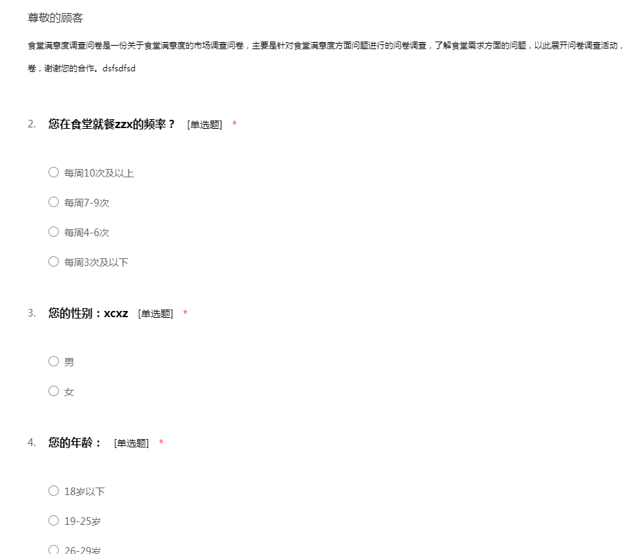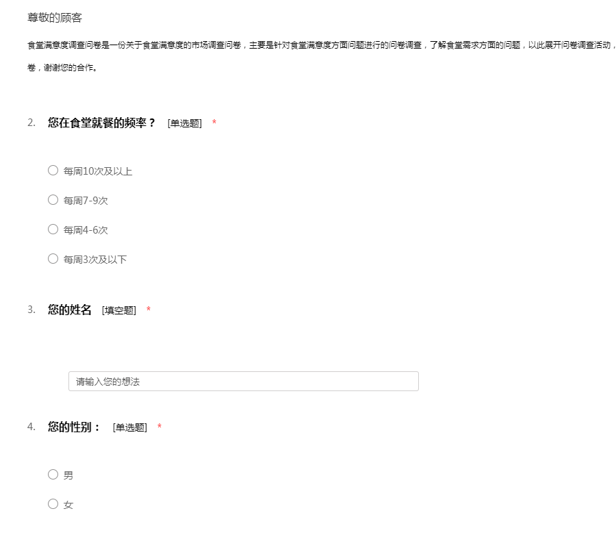 食堂满意度调查问卷是一份关于食堂满意度的市场调查问卷,主要是针对食堂满意度方面问题进行的问卷调查,了解食堂需求方面的问题,以此展开问卷调查活动,耽误您一些宝贵时间,回答食堂满意度调查问卷,谢谢您的合作。dsfsdfsd