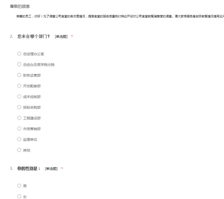 ——亲爱的员工,你好!为了调查公司食堂的各方面情况,提高食堂的服务质量我们特此开设对公司食堂就餐满意度的调查。请大家根据自身实际就餐情况填写此问卷,以帮助我们进行改进。感谢你的参与!