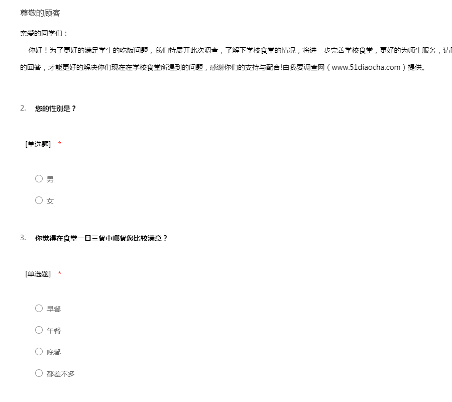 你好!为了更好的满足学生和老师的餐饮问题,我们特展开此次调查,了解下学校食堂的情况,将进一步完善学校食堂,更好的为师生服务,请同学们认真回答下以下的问题,只有如实的回答,才能更好的解决现在学校食堂所存在的问题,感谢你们的支持与配合!