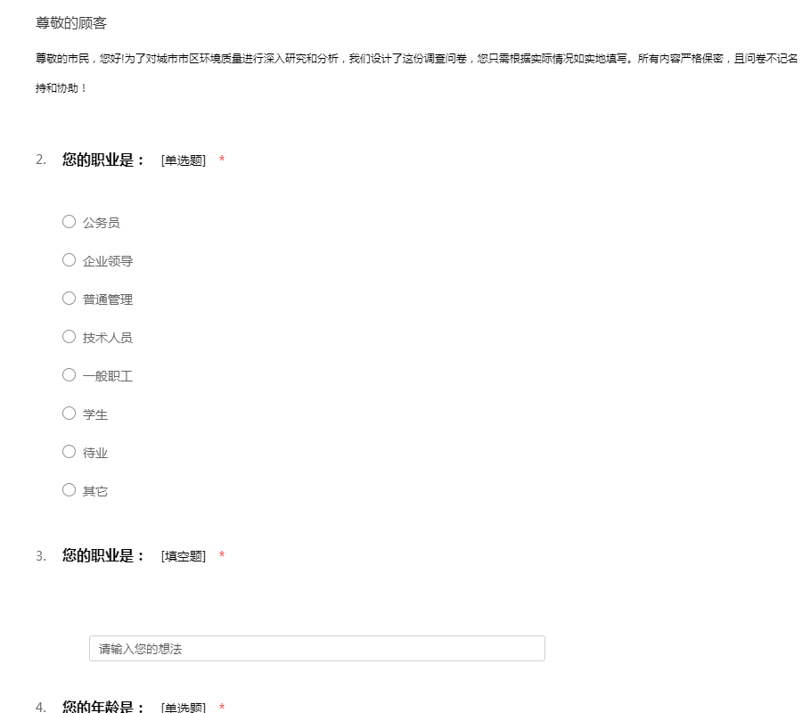 环保部近日向媒体通报了《2014中国环境状况公报》,公报中161的个城市,有145个城市空气质量超标。2013年全国生态环境质量总体“一般”,2461个县域中“优”、“良”、“一般”、“较差”和“差”的县域分别有558个、1051个、641个、196个和15个。生态环境质量为优和良的县域占国土面积的46.7%,一般的占23.0%,较差和差的占30.3%。公报上还列举了其它方面的环境情况,你觉得你所在的城市生活环境如何?在此,我们特别设计了这份调查问卷,欢迎你的积极参与!