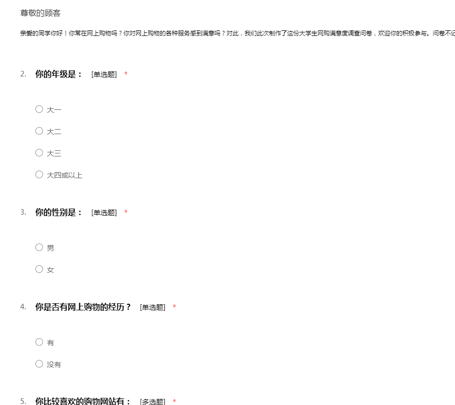 亲爱的同学你好!你常在网上购物吗?你对网上购物的各种服务感到满意吗?对此,我们此次制作了这份大学生网购满意度调查问卷,欢迎你的积极参与。问卷不记名,所以请不必担心。感谢你对我们的支持!