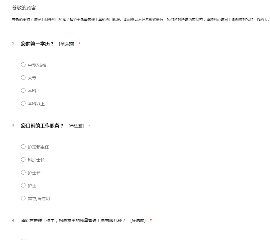 亲爱的老师:您好!问卷的目的是了解护士质量管理工具的应用现状。本问卷以不记名形式进行,我们将对所填内容保密,请您放心填写!谢谢您对我们工作的大力支持与配合。