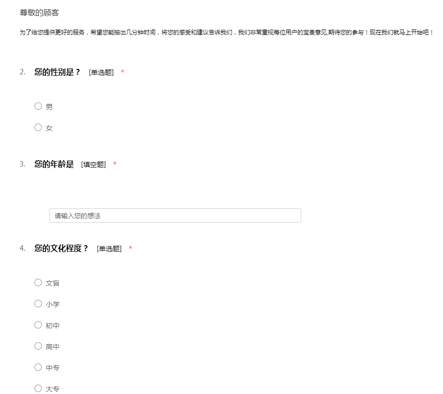 为了给您提供更好的服务,希望您能抽出几分钟时间,将您的感受和建议告诉我们,我们非常重视每位用户的宝贵意见,期待您的参与!现在我们就马上开始吧!