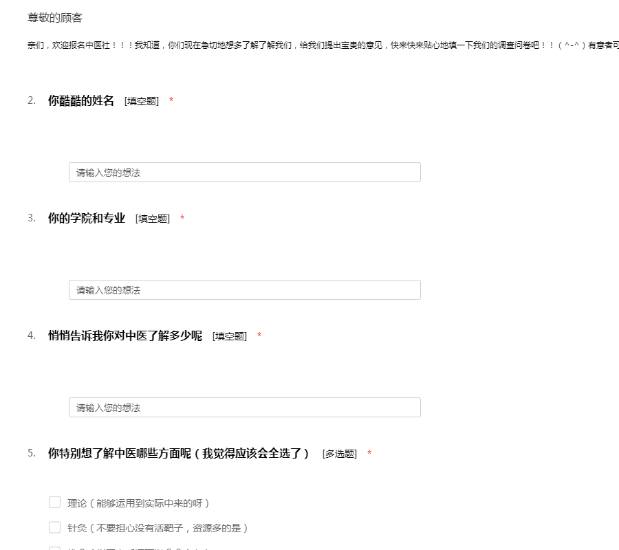 亲们,欢迎报名中医社!!!我知道,你们现在急切地想多了解了解我们,给我们提出宝贵的意见,快来快来贴心地填一下我们的调查问卷吧!!(^-^)有意者可加qq:490269075
