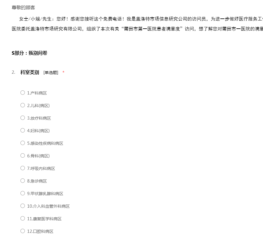 女士/小姐/先生:您好!感谢您接听这个免费电话!我是盖洛特市场信息研究公司的访问员,为进一步做好医疗服务工作,提升医院服务品质,莆田市第一医院委托盖洛特市场研究有限公司,组织了本次有关“莆田市第一医院患者满意度”访问,想了解您对莆田市一医院的满意程度,谢谢您的支持和配合!