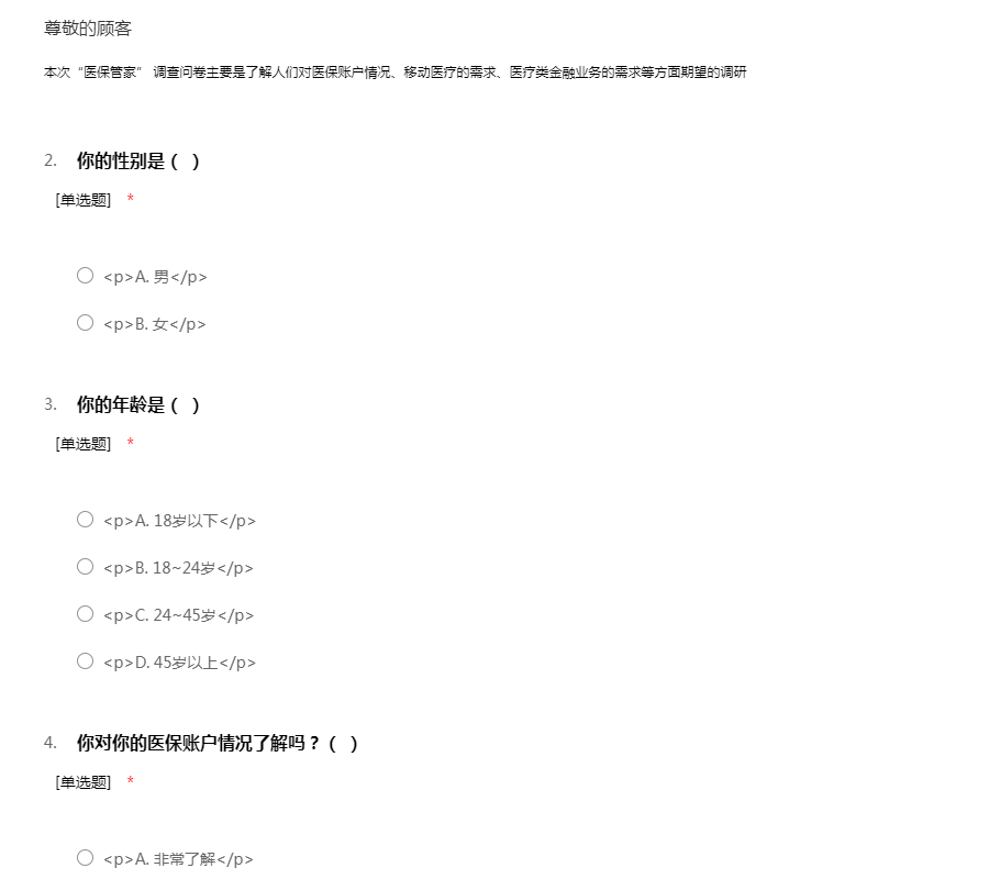本次“医保管家” 调查问卷主要是了解人们对医保账户情况、移动医疗的需求、医疗类金融业务的需求等方面期望的调研
