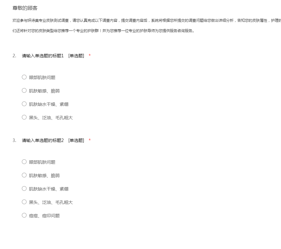 欢迎参与妍诗美专业皮肤测试调查,请您认真完成以下调查内容,提交调查内容后,系统将根据您所提交的调查问题给您做出详细分析,告知您的皮肤属性,护理的要点,以及您所遇到的问题的解决方案。同时我们还将针对您的皮肤类型给您推荐一个专业的护肤群!并为您推荐一位专业的护肤导师为您提供服务咨询服务。