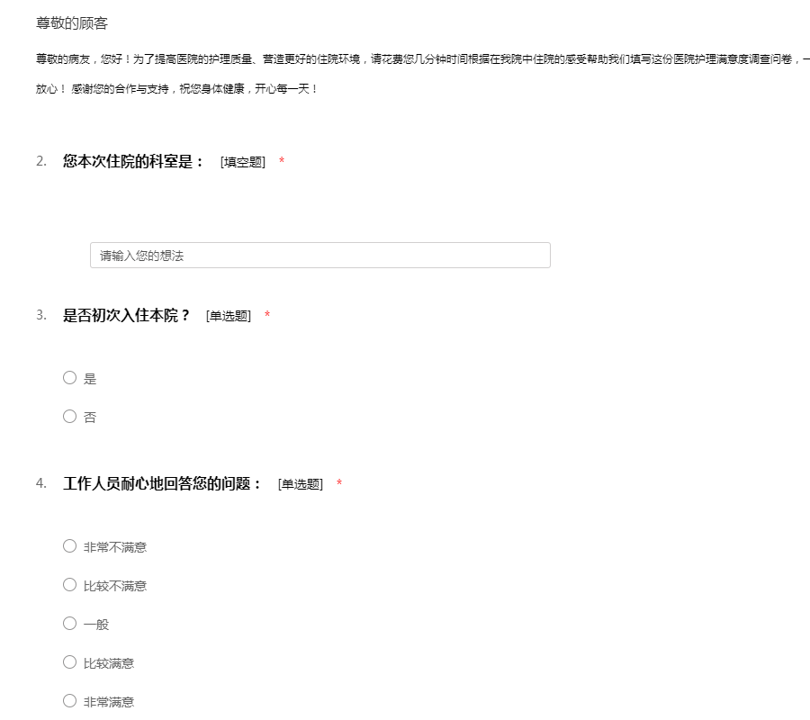 亲爱的病友,你好!为提高我院职能部门的工作情况,我们特此设计了这份医院职能部门满意度调查表。问卷不记名,所以请不必有所顾虑,根据您的实际情况来填答此份问卷。感谢你对我们工作的支持与合作!