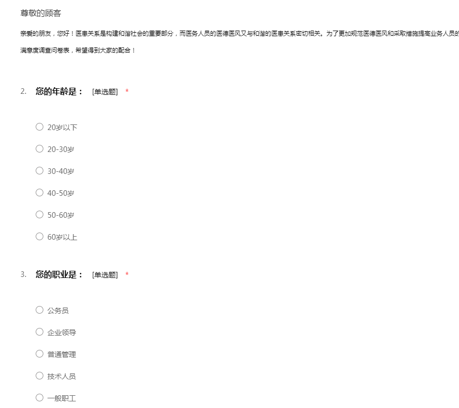 亲爱的朋友,您好!医患关系是构建和谐社会的重要部分,而医务人员的医德医风又与和谐的医患关系密切相关。为了更加规范医德医风和采取措施提高业务人员的职业道德水平,我们对此展开了此次的医德医风满意度调查问卷表,希望得到大家的配合!