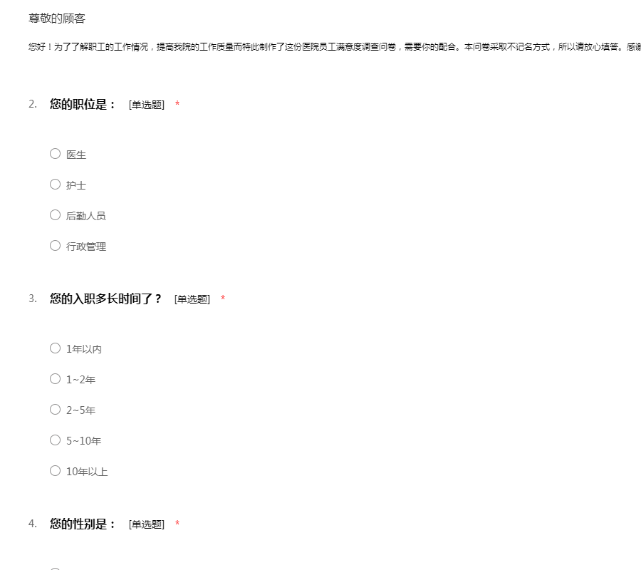 您好!为了了解职工的工作情况,提高我院的工作质量而特此制作了这份医院员工满意度调查问卷,需要你的配合。本问卷采取不记名方式,所以请放心填答。感谢你的协助!