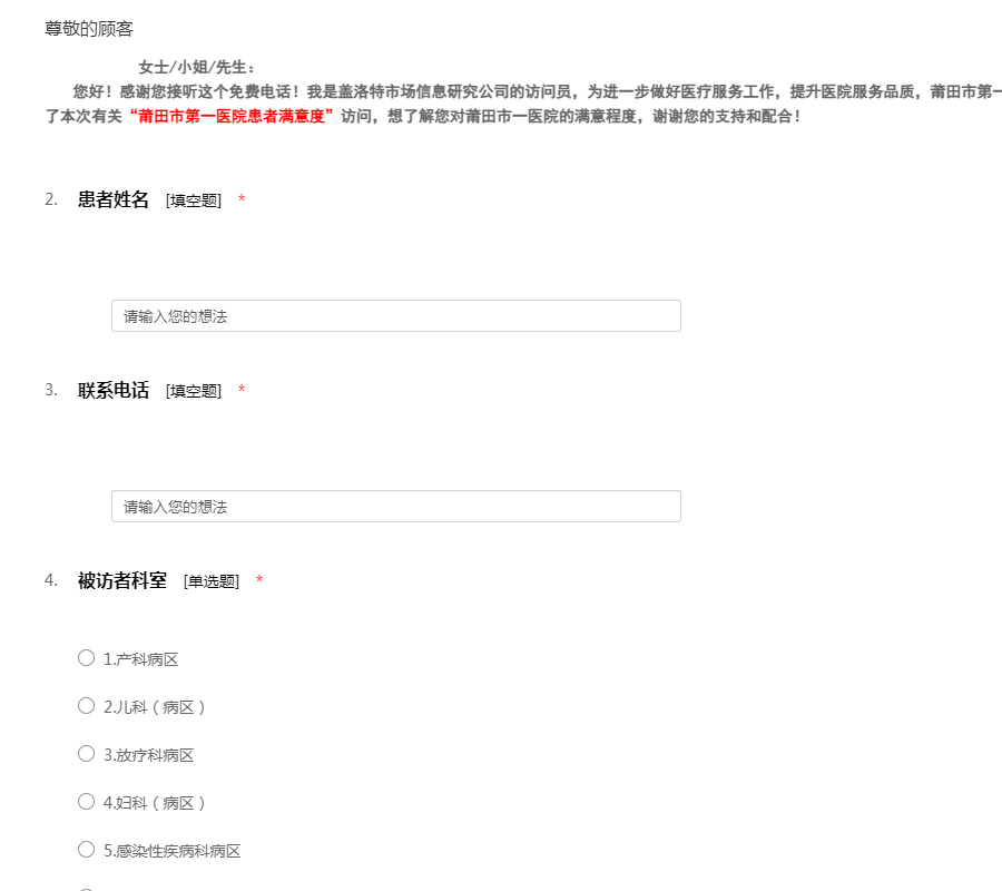 女士/小姐/先生: 您好!感谢您接听这个免费电话!我是盖洛特市场信息研究公司的访问员,为进一步做好医疗服务工作,提升医院服务品质,莆田市第一医院委托盖洛特市场研究有限公司,组织了本次有关“莆田市第一医院患者满意度”访问,想了解您对莆田市一医院的满意程度,谢谢您的支持和配合!