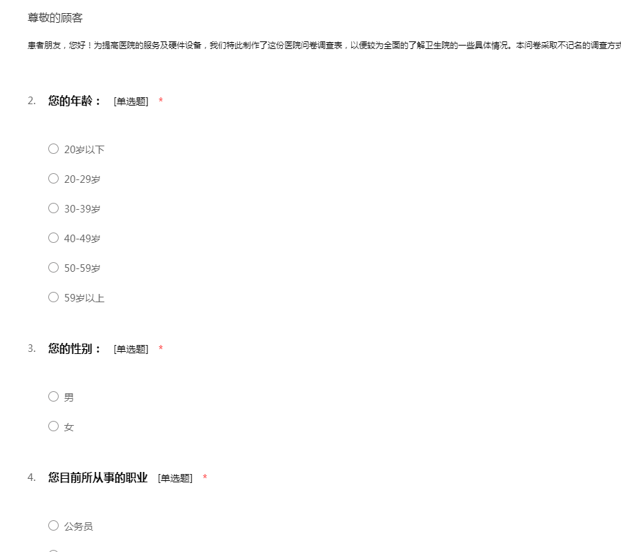 患者朋友,您好!为提高医院的服务及硬件设备,我们特此制作了这份医院问卷调查表,以便较为全面的了解卫生院的一些具体情况。本问卷采取不记名的调查方式,所以请放心的如实填写。感谢您的配合!
