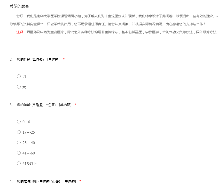 您好!我们是南华大学医学院课题调研小组,为了解人们对非主流医疗认知现状,我们特意设计了此问卷,以便提出一些有效的建议。本次调查采用无记名的形式,我们承诺对您填写的资料完全保密,只做学术统计用,您不用承担任何责任。请您认真阅读,并根据实际情况填写。衷心感谢您的支持与合作! 注释:西医药及中药为主流医疗,除此之外各种疗法均属非主流疗法,基本包括巫医,宗教医学,传统气功艾灸等疗法,国外顺势疗法,阿育吠陀,及身心灵疗法。