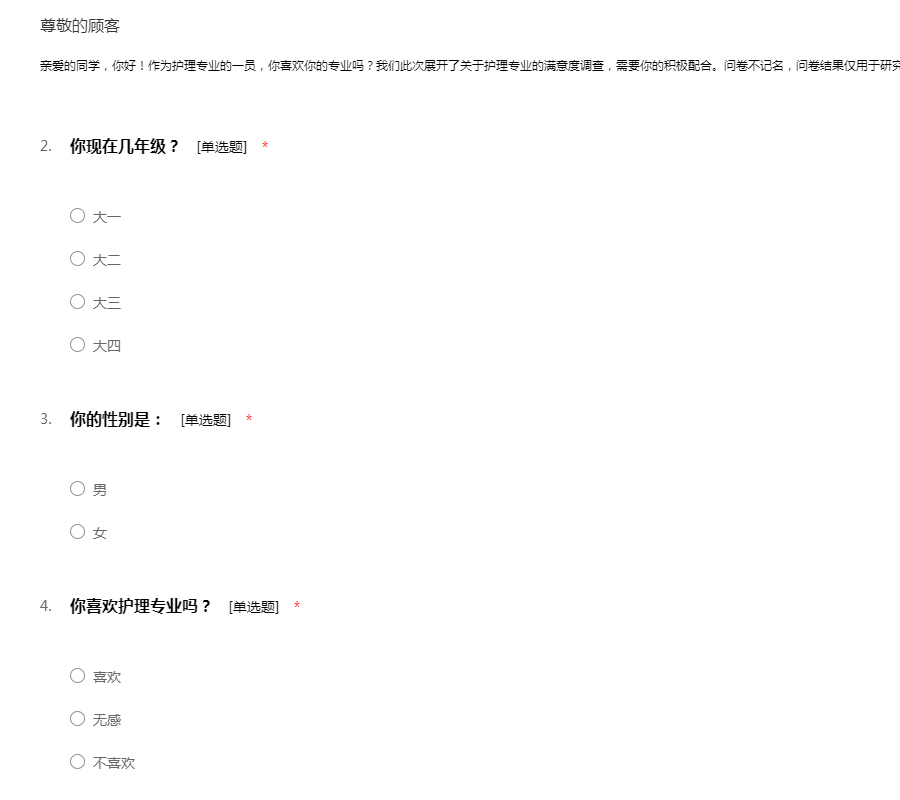 亲爱的同学,你好!作为护理专业的一员,你喜欢你的专业吗?我们此次展开了关于护理专业的满意度调查,需要你的积极配合。问卷不记名,问卷结果仅用于研究之用,请不必担心。感谢你的大力支持!