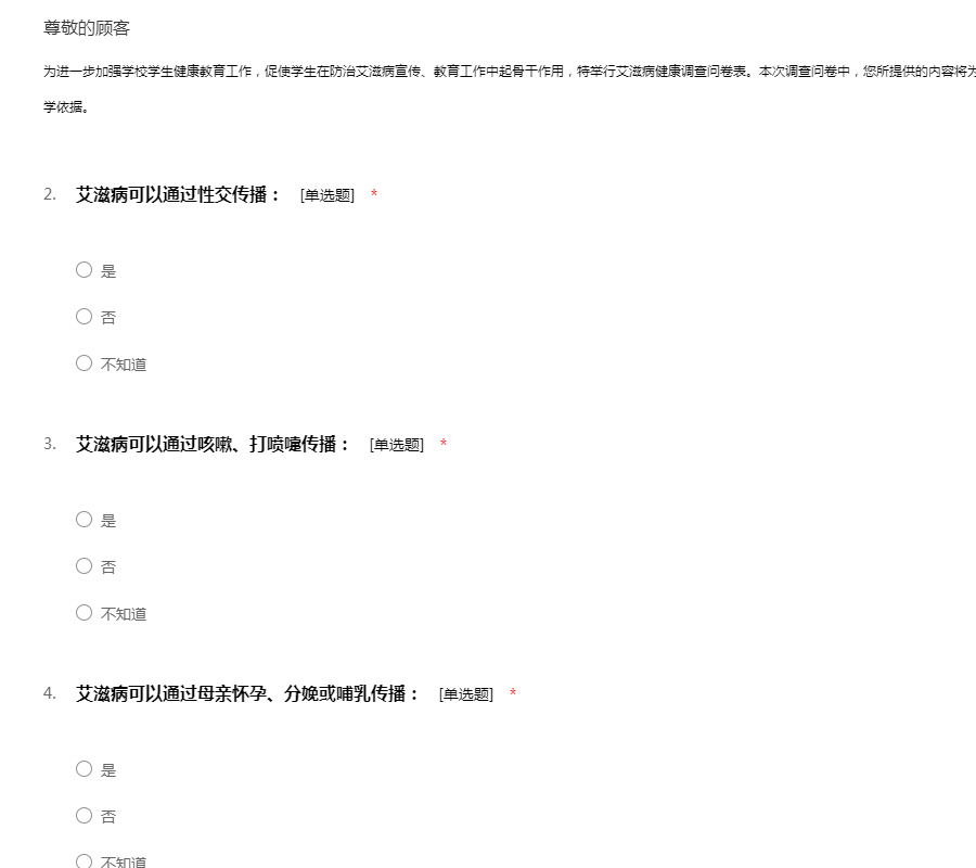 为进一步加强学校学生健康教育工作,促使学生在防治艾滋病宣传、教育工作中起骨干作用,特举行艾滋病健康调查问卷表。本次调查问卷中,您所提供的内容将为我校开展防治艾滋病健康教育工作提供重要的科学依据。