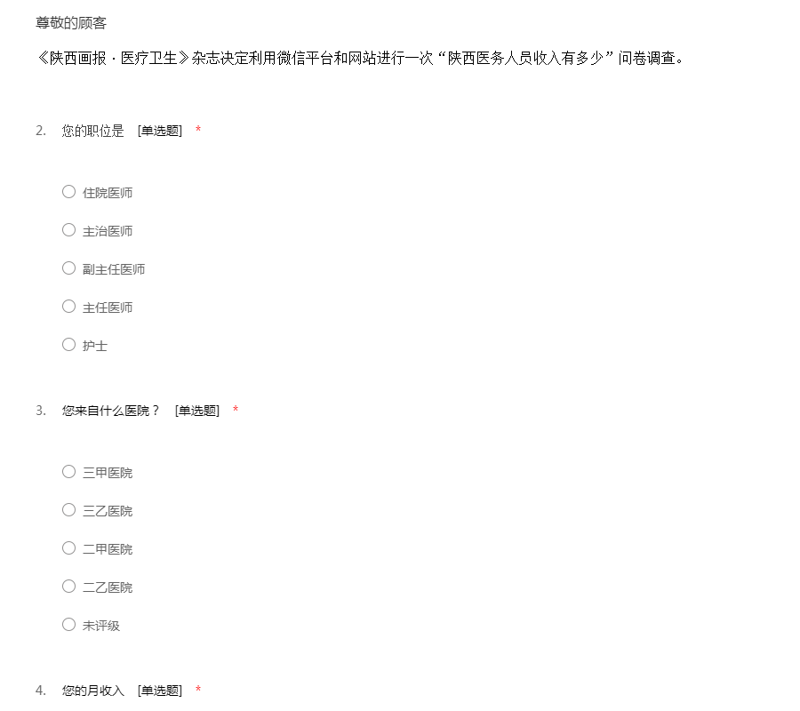 《陕西画报·医疗卫生》杂志决定利用微信平台和网站进行一次“陕西医务人员收入有多少”问卷调查。
