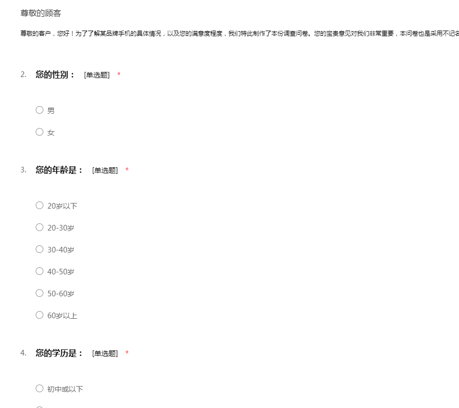 尊敬的客户,您好!为了了解某品牌手机的具体情况,以及您的满意度程度,我们特此制作了本份调查问卷。您的宝贵意见对我们非常重要,本问卷也是采用不记名方式,所以请放心的如实填写。感谢您的参与!
