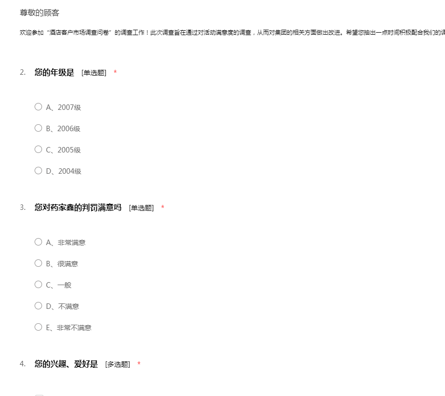 本问卷为不记名调查,评估内容后面的“非常满意”(100分)“满意”(80分)“一般”(60分)“不满意”(40分)“很不满意(20分)”的对应定义如下: