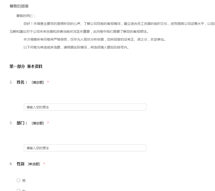 尊敬的同仁: ——您好!本调查主要目的是倾听您的心声、了解公司目前的客观情况,建立适合员工发展的组织文化,进而提高公司运营水平,以促进公司业绩增长,为员工谋求福利。您的见解和建议对于公司未来发展和改善当前状况至关重要,此问卷中我们需要了解您的客观想法。 ——本次调查所有问卷将严格保密,仅作为入现状分析依据,您所回答的没有正、误之分,欢迎参加。 ——以下问卷为单选或多选题,请根据实际情况,将选项填入题后的括号内。